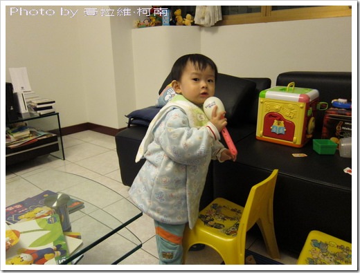 小柯南愛唱歌不是一天兩天的事了, 但不知道從哪學來的, 現在開始會拿個東西在手上當麥克風, 例如他現在手上這支搖鈴。 瞧他唱的多麼高興, 也頗有架勢。 話說這陣子除了日本NHK的兒歌外, 巧虎跟水果冰淇淋的歌他也很愛。 「阿~~」 他發現照相機飛撲過來了, 但是‧‧‧ 小柯南手裡還是拿著麥克風呢!! Technorati 的標籤:Baby,親子,小柯南,唱歌,麥克風,生活...